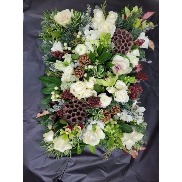A garden pillow wreath is a type of funeral flower arrangement that is shaped like a pillow and typically made from a variety of flowers and foliage. It is often displayed at a funeral service as a way to pay tribute to the deceased and provide comfort to their loved ones. The wreath is typically displayed on a stand or hung on a wall near the coffin or casket. Some people also choose to have the wreath delivered to the deceased person’s home or to a place that was special to them.